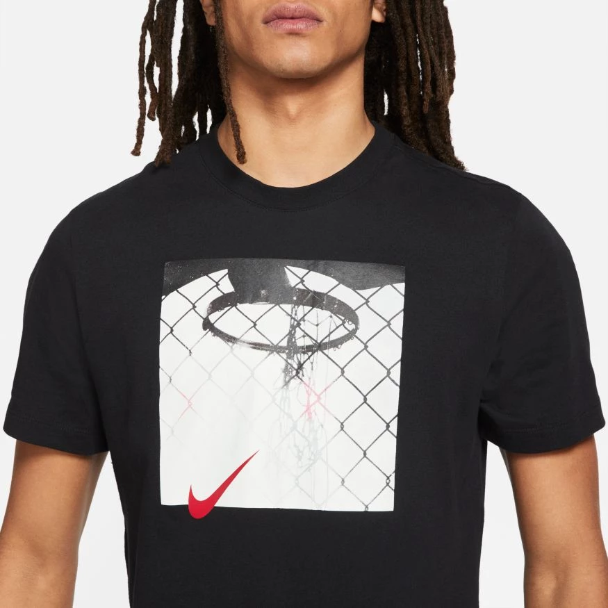 Concrete courts and chain-link fence is basketball at its grittiest. The Nike Basketball Photo T-Shirt captures a glimpse of the city game with photorealistic artwork on soft fabric.